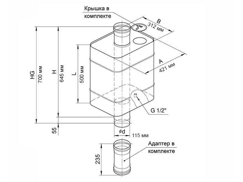 Установка бака производится "по конденсату". Нижняя часть трубы бака теперь разъемная. Проверенный честный объём бака. Адаптер М-М 235 мм в комплекте!