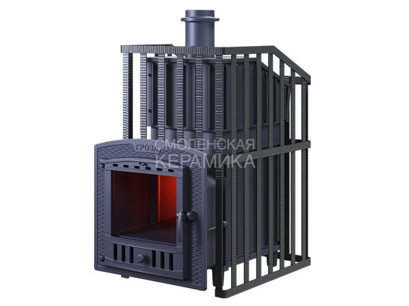 Печь для бани GROZA 24 (П)2 Ураган - расширенный комплект печи в сетке. Максимально приближенный вариант печи для режимов русской парной, имеющий непосредственно закрытую чугунным коробом каменку, дверцу для пара с ручкой из бука, увеличенную до 50 см чугунную стартовую трубу. Печь легко модернизируется до полноценной печи предназначенной для Русской бани путем замены стальной сетки на каменную облицовку без демонтажа дымохода.