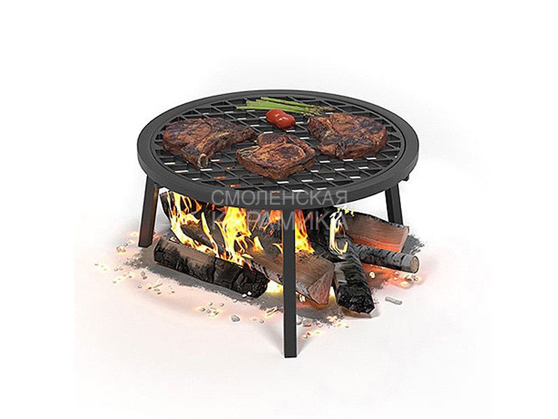 Подставка не займёт много места в багажнике автомобиля. Она устанавливается над костром, на ней размещается круглая решётка и вы можете готовить мясо, рыбу, овощи с клетчатым рисунком настоящего гриля!