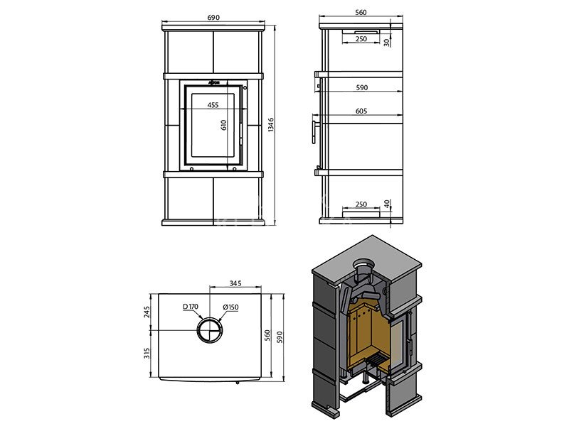 Топочная камера изготовлена из особо прочной котловой стали, рассчитана на пристенное размещение. Топка изнутри облицована вермикулитом, что обеспечивает максимальную теплоёмкость печи, защищает стены от прогорания и избыточного нагрева.