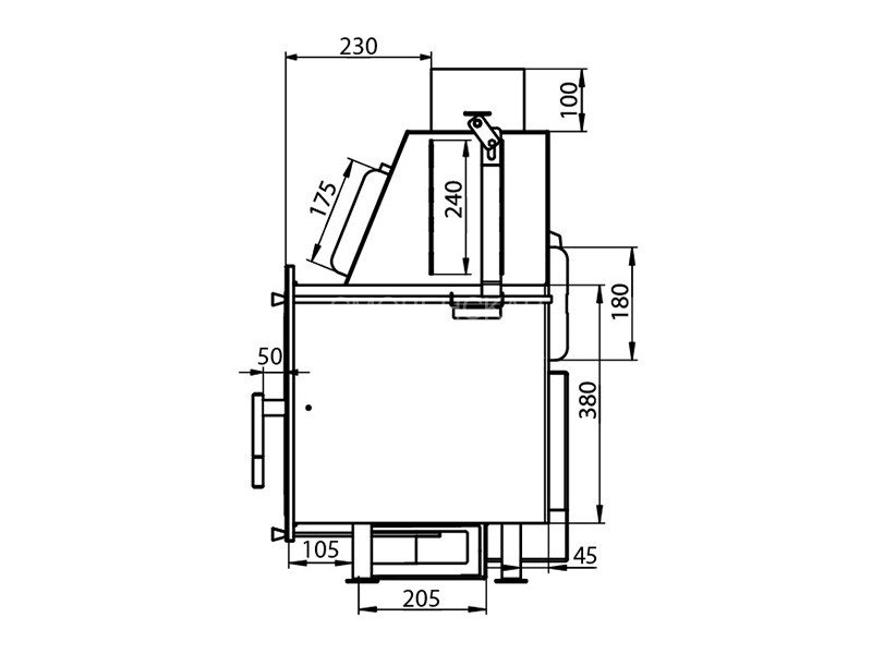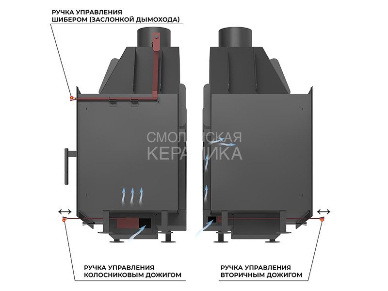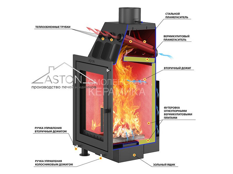 Топка оборудована системой вторичного дожига дымовых газов, которая позволяет получить максимум энергии при горении дров. Каналы вторичного дожига расположены на задней стенке топочной камеры прямо в вермикулитовой облицовке.