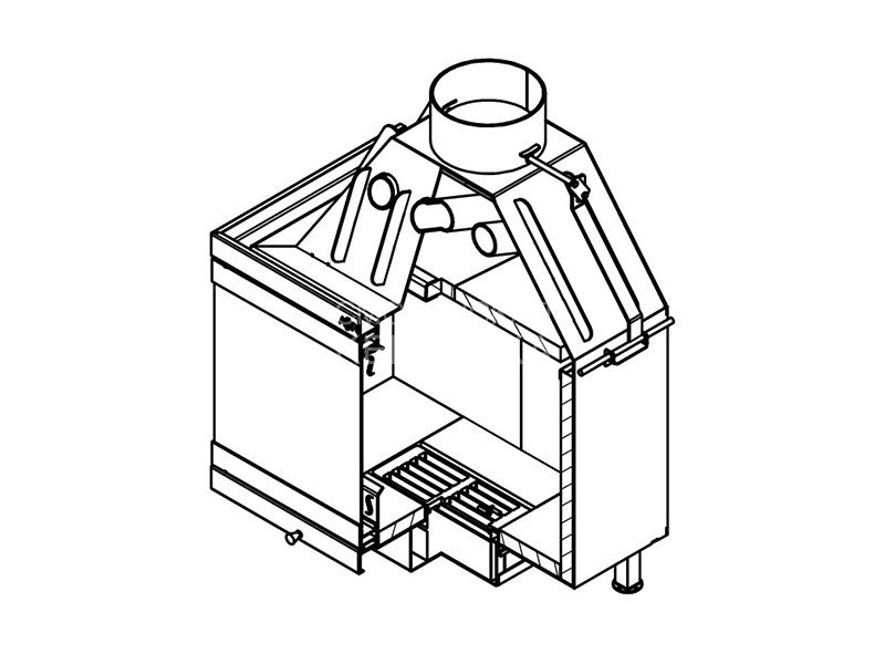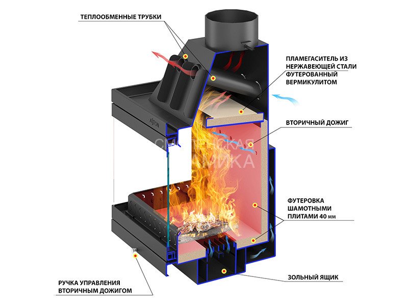 Топка оборудована системой вторичного дожига дымовых газов, которая позволяет получить максимум энергии при горении дров. Каналы вторичного дожига расположены на задней стенке топочной камеры прямо в шамотной облицовке.