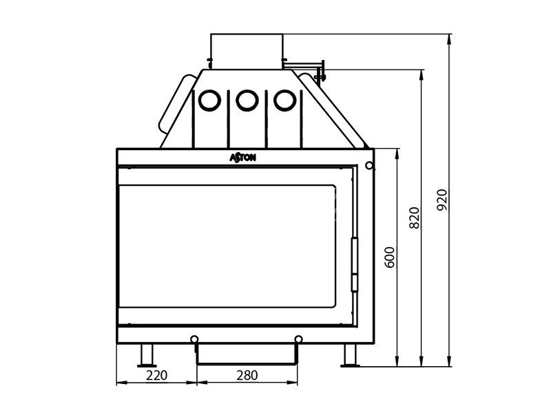 Трубы, размещённые над топочной камерой в области дымосборника, увеличивают скорость движения нагретого воздуха и усиливают конвекционные возможности каминной топки АСТОН 700 L. Пламя и дымовые газы, догорая, огибают пламегаситель в верхней части топочной камеры. В дымосборнике. над конвекционными трубами, расположен второй пламегаситель, который повторно меняет направление движения газов и таким образом способствует их полному догоранию в топке. За счёт совместной работы двух пламегасителей достигается максимальная тепловая эффективность каминной топки АСТОН 700 L, в том числе повышается те