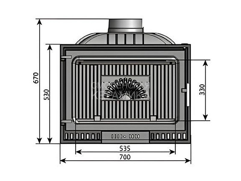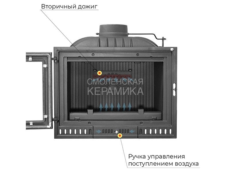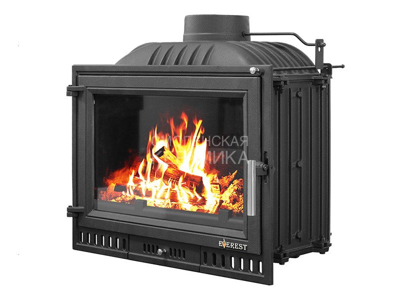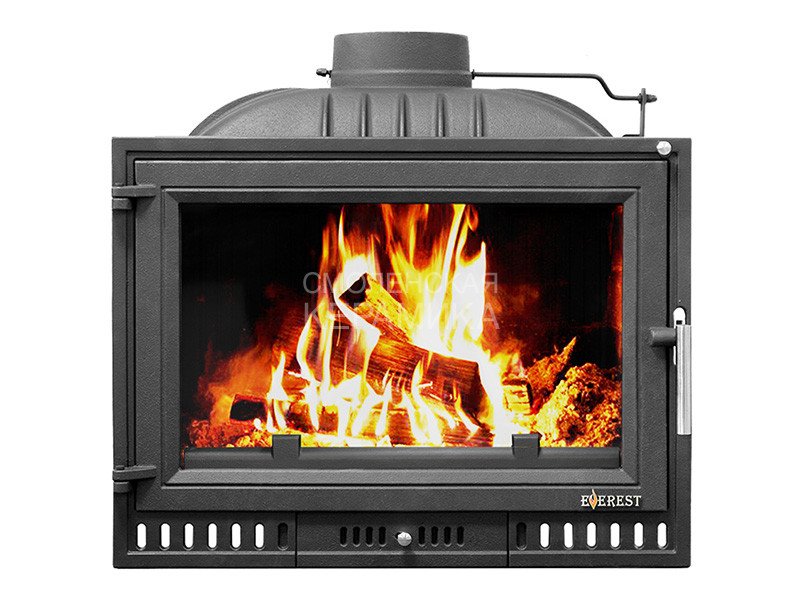 Каминная топка EVEREST Z14 изготовлена из качественного жаростойкого чугуна (ГОСТ 1412-85) с толщиной стенок 6-10 мм. Вес топки составляет 104 кг. Модель рассчитана на обогрев помещений объёмом до 280 м³. Топка усилена чугунными вставками с системой вторичного дожига. С помощью этой функции по каналам подачи вторичного воздуха поступает воздух, который нагревается при прохождении между топочной камерой и стенками корпуса. Далее нагретый воздух через дефлектор поступает в топку, перемешивается с газами - продуктами горения, чем вызывает повторное возгорание. Патрубок дымохода диаметром 180 мм не универсальный. оснащён поворотным шибером. Заслонка сделана из чугуна, а её положение регулируется ручкой на передней панели топки.