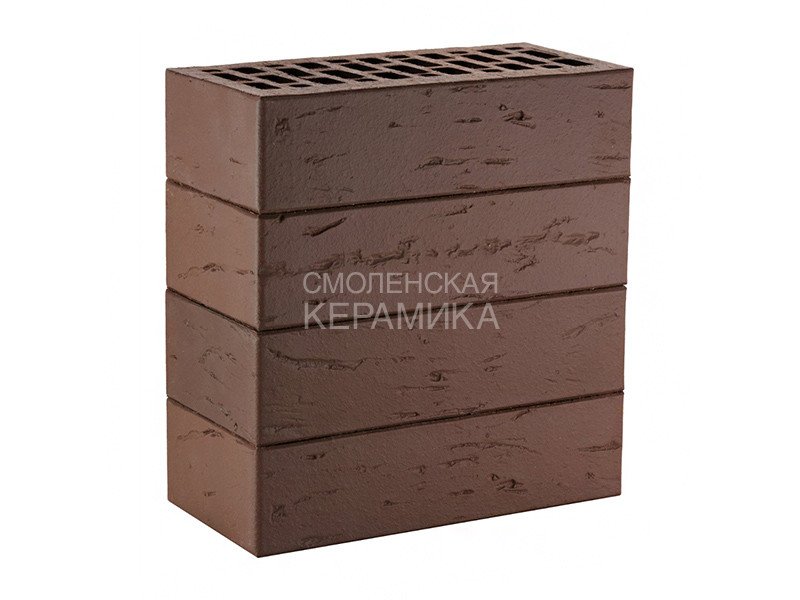 Керамический кирпич ЛСР лицевой (облицовочный) пустотелый рустик одинарного формата 1NF имеет размер 250*120*65мм. Данный кирпич тёмно-коричневого цвета, с рустированной поверхностью со сколотыми (рваными) краями лицевой части. Применяется для облицовки фасадов, наружных и внутренних стен зданий, заборов. Кирпич керамический изготавливается из глины путём обжига.