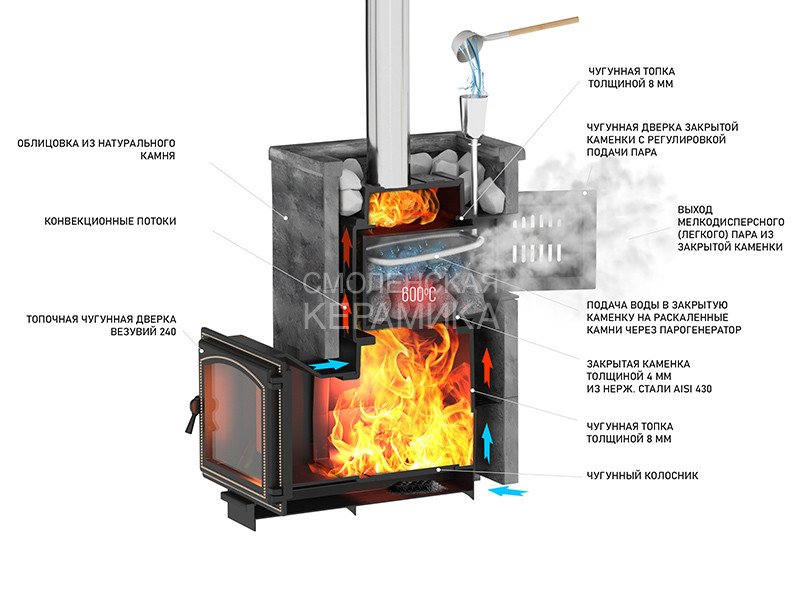 Печь ВЕЗУВИЙ Легенда Русский Пар 18 (240) предназначена для получения мелкодисперсного пара, без которого невозможно представить настоящую русскую баню. Этот полезный пар, который не обжигает дыхательные пути, благотворно влияет на состояние организма в целом, позволяет в полной мере наслаждаться банными процедурами. Получение мелкодисперсного пара становится возможным благодаря наличию у печи закрытой каменки.