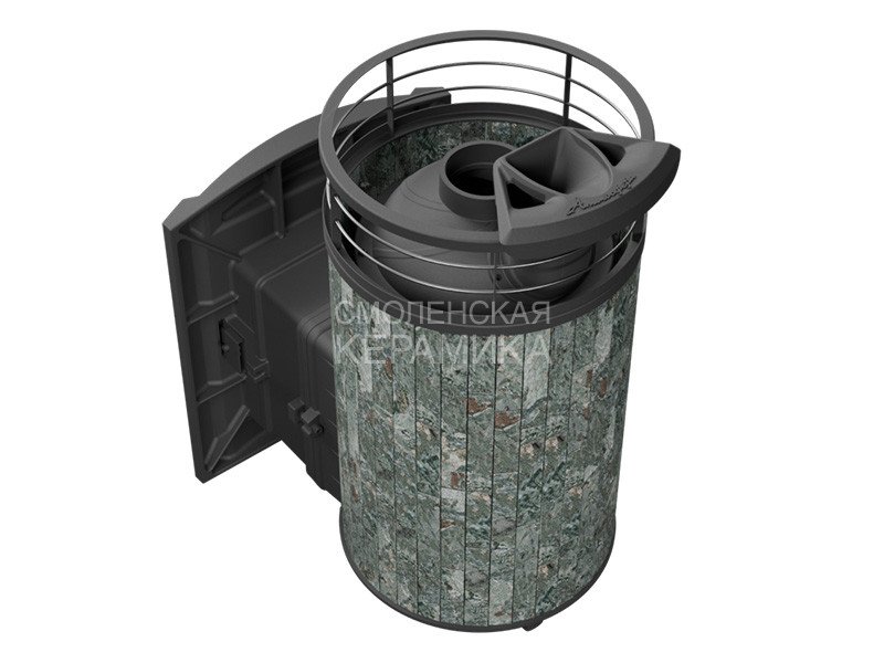 Практичная и компактная модель. Ламели из змеевика по периметру внешней каменки не только обладают хорошими теплонакопительными свойствами, но и придают печи оригинальный внешний вид.