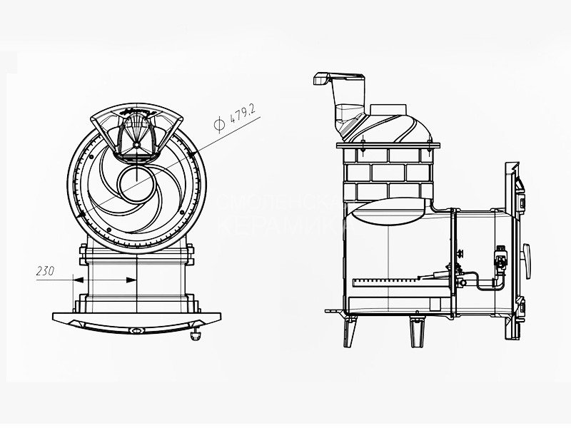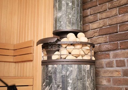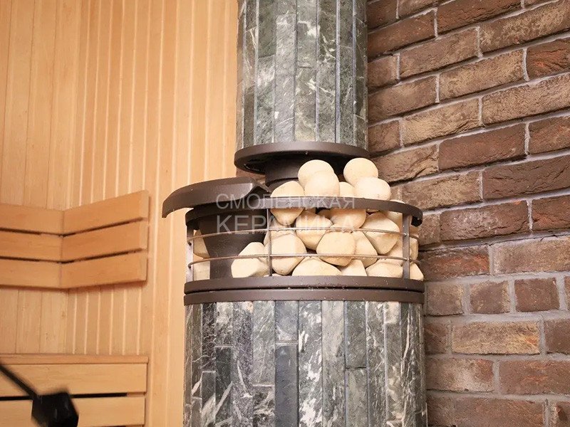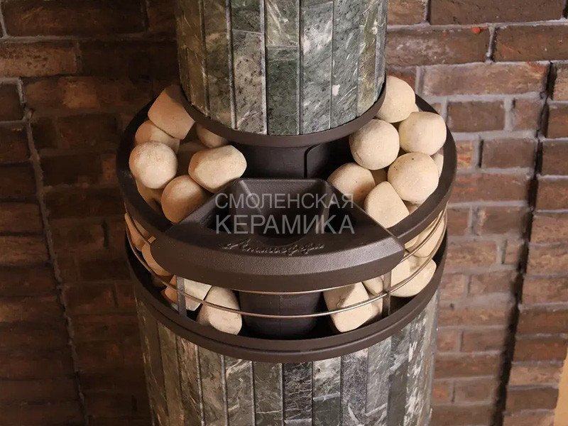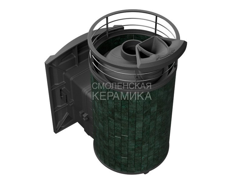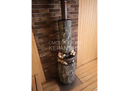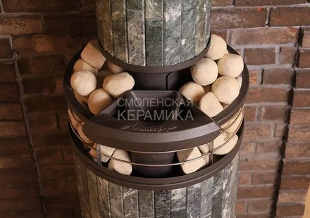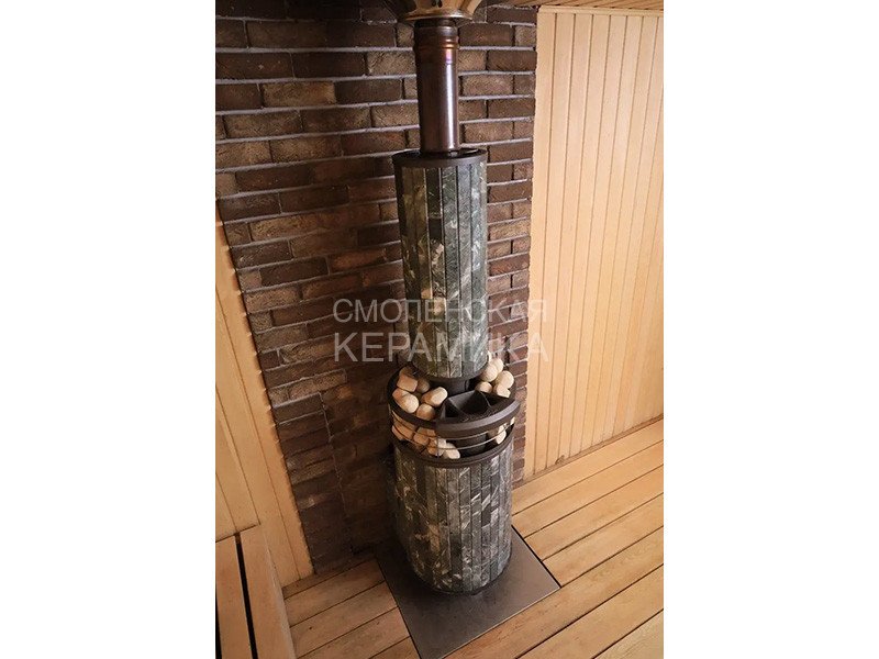 Практичная и компактная модель. Ламели из змеевика по периметру внешней каменки не только обладают хорошими теплонакопительными свойствами, но и придают печи оригинальный внешний вид.