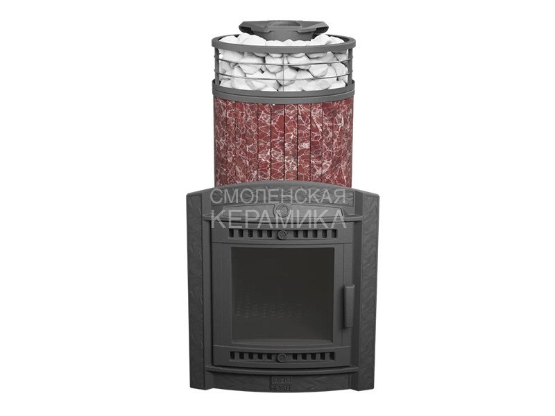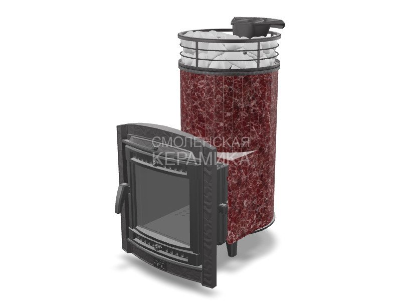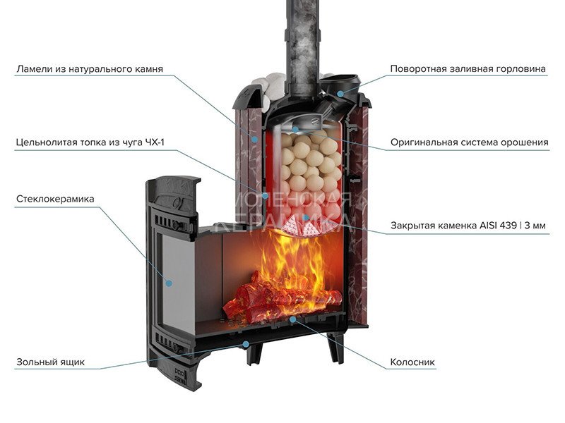 Модель с увеличенной каменкой и повышенной производительностью. Ламели по периметру внешней каменки не только обладают хорошими теплонакопительными свойствами, но и придают печи оригинальный внешний вид.