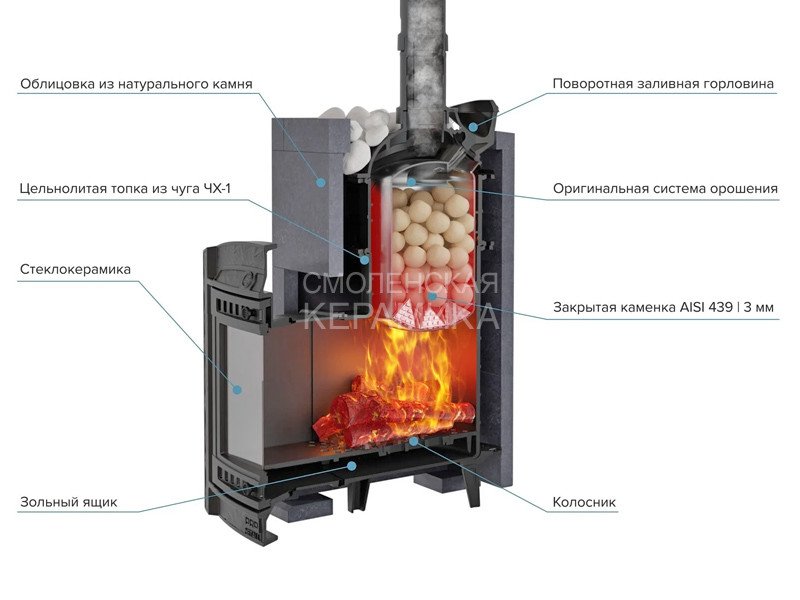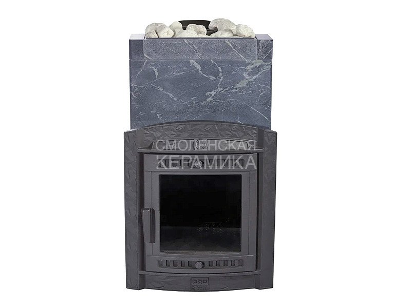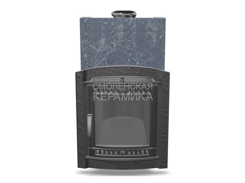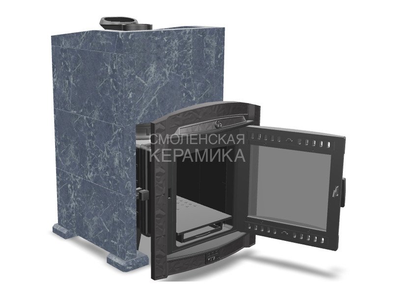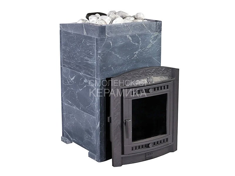 Модель печи в стильной и практичной облицовке из «Талькохлорита». За счет использования несущих брусков, состоящих из цельного камня, теплоёмкость печи увеличивается на 50%. Конструкция просто собирается и позволяет легко заменить любую деталь в случае необходимости. Цена и КПД такой облицовки отличаются оптимальным соотношением.