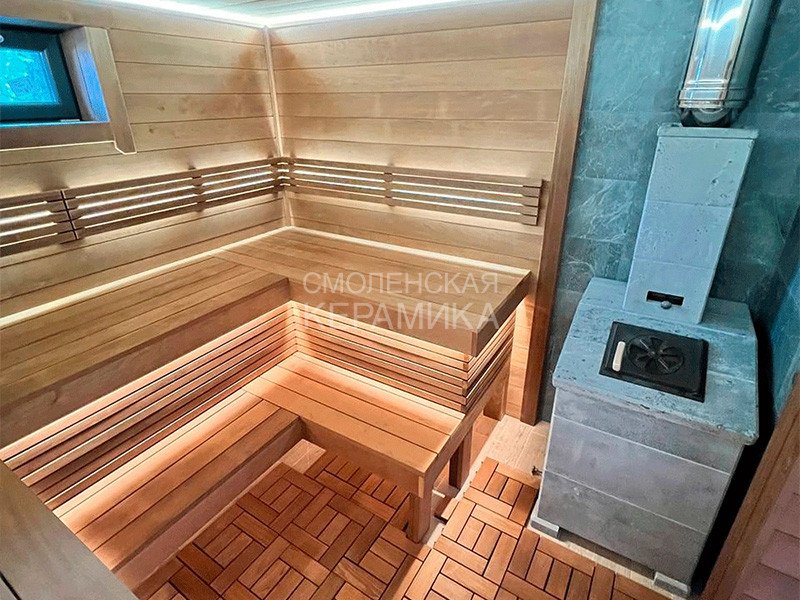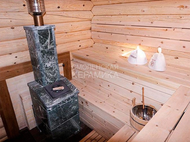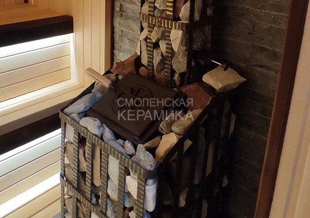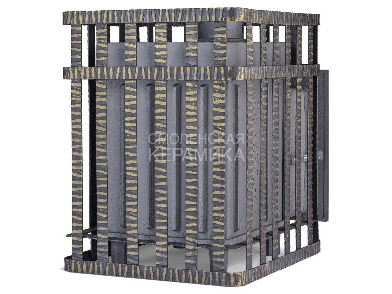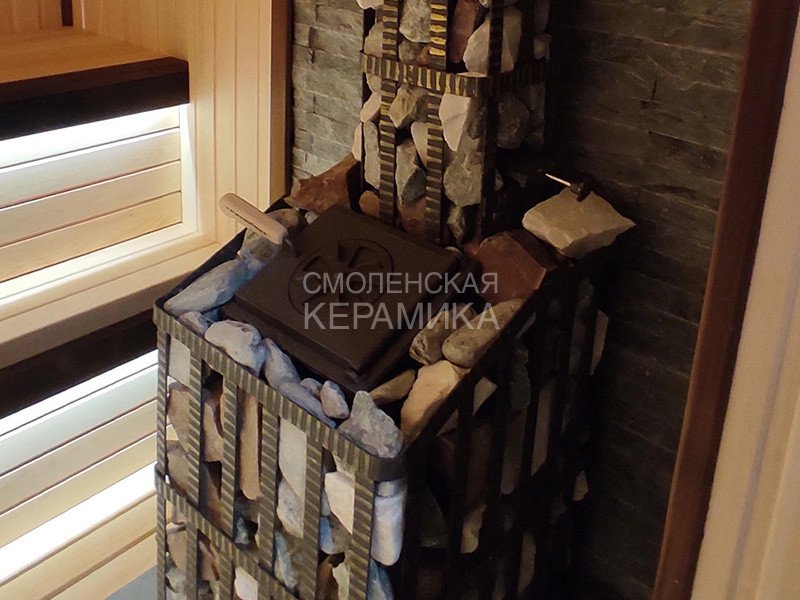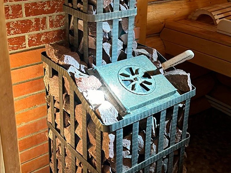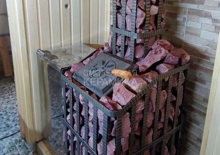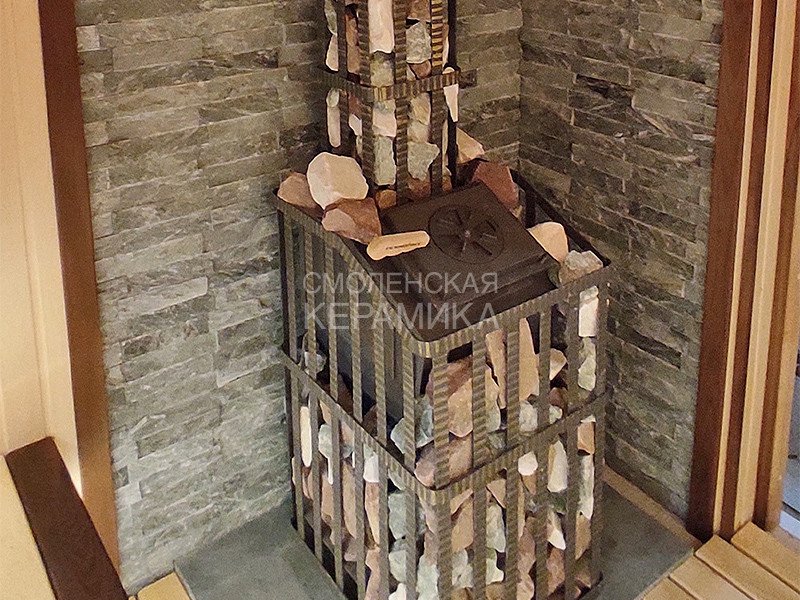 Чугунная банная печь в сетке для парного помещения объемом 18 м³.