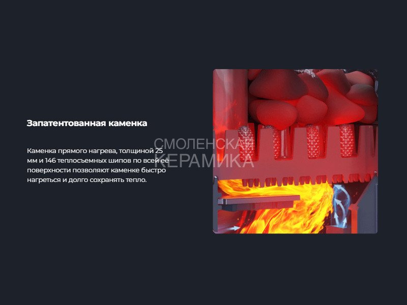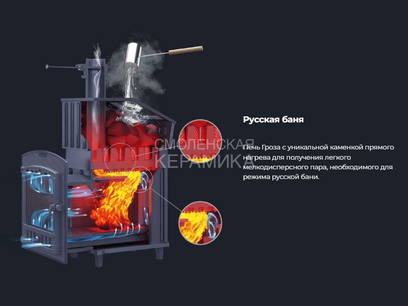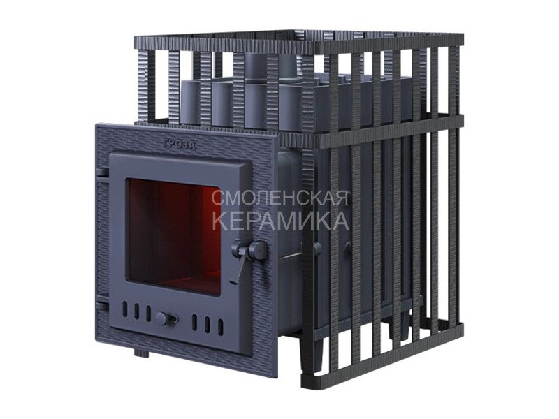 Чугунные банные печи GROZA — это современные печи, рассчитанные на малые и средние размеры парных. Печь имеет прочную сборную конструкцию, без резьбовых и сварных соединений, детали выполнены из легированного чугуна. Топка печей «Гроза» состоит из двух камер, разделенных пламегасителем. Радиаторные выступы каменки, направленные вглубь топки, увеличивают площадь контакта огня с каменкой и эффективность теплосъема. Для увеличения площади поверхности нагрева камней каменка снаружи оборудована чугунными шипами, направленными вверх. Между шипами укладываются банные камни или дополнительные чугунные заклады, такие как ядра и чугунные шишки. Сами чугунные шипы также являются частью заряда для лучшего испарения воды.