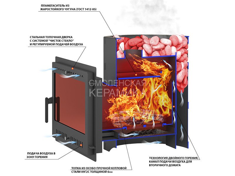 Топка печи изготовлена из особо прочной котловой стали марки 09Г2С. Толщина верхней и задней части 6 мм, толщина боковых стенок 4 мм. Топка имеет скошенные углы в нижней части боковых стенок топки. Такая конструкция облегчает уход за топкой, предотвращает высокую тепловую нагрузку на боковые стенки печи и обеспечивает дополнительную жёсткость стенок.