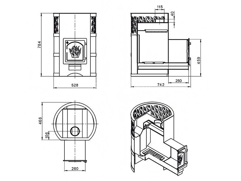 Чугунные детали - колосник и пламегаситель, не меняют своей геометрии во время топки, хорошо противостоят высокой температуре.
