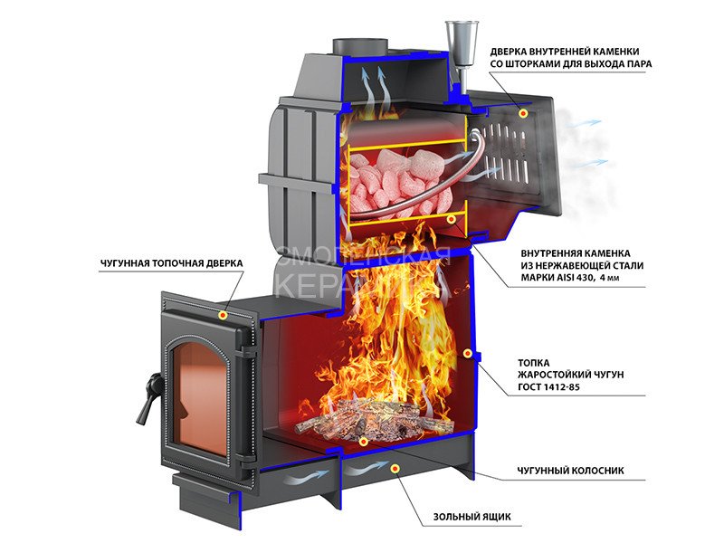 Печи «Легенда Русский пар 24» отличаются наличием закрытой каменки, в которой камни прогреваются до температуры 600°С, что позволяет создать в парилке наиболее благоприятный микроклимат, не пересушивая и не перегревая воздух. Вода подается в центральную самую горячую часть закрытой каменки через воронку, дверь закрытой каменки при этом должна быть приоткрыта для поступления мелкодисперсного пара в парное отделение. Все элементы топки отлиты из жаропрочного чугуна и соединены между собой с помощью болтового соединения через термостойкий шнур и герметик, а закрытая каменка изготовлена из жаростойкой высоколегированной 4 мм нержавеющей стали.