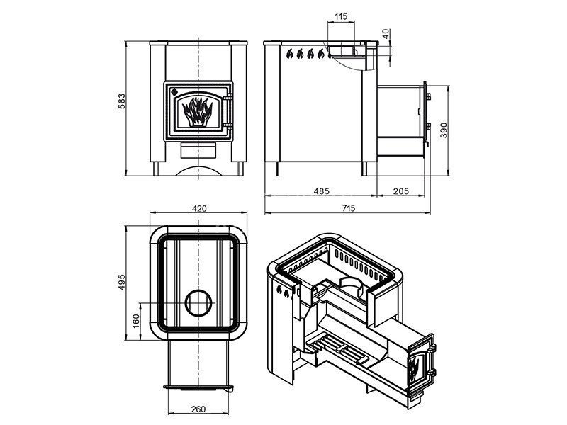 Дверка, пламегаситель и колосник изготовлены из чугуна, что увеличивает их прочность и срок службы.