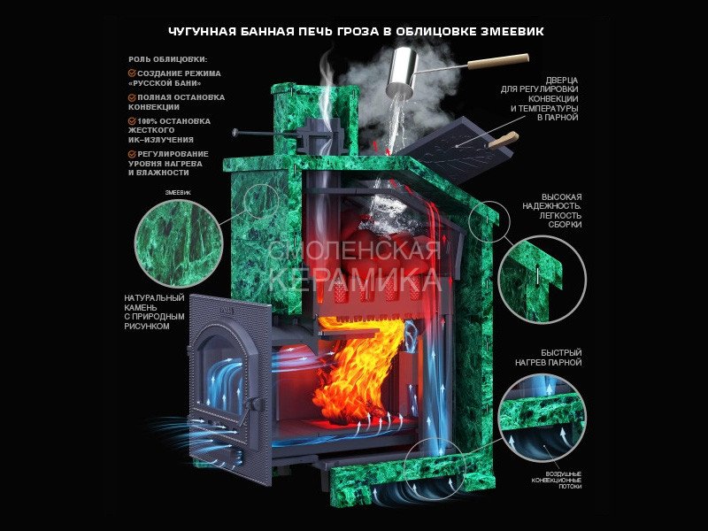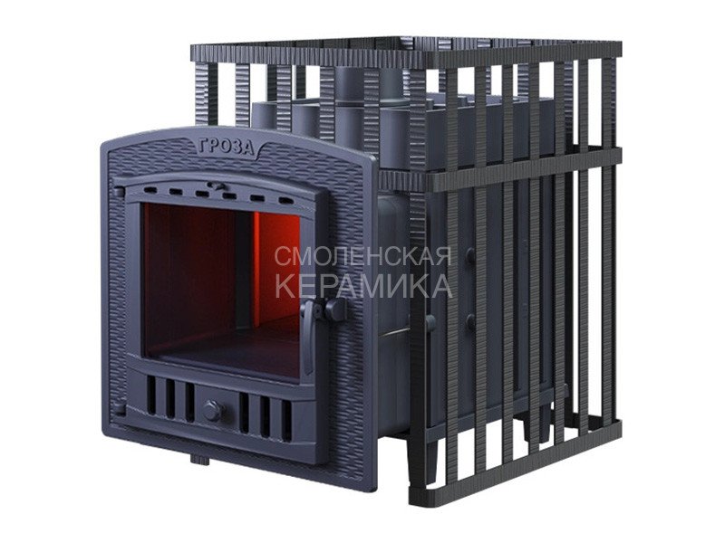 Печь для бани Гроза разработана как максимально экономичная модель для частного применения. Основной принцип работы печи сохранён – получение пара с теплоёмкой каменки прямого нагрева. Каменка является сводом топки, нагревается с нижней поверхности снабженной теплосъемными шипами для увеличения контакта с пламенем.