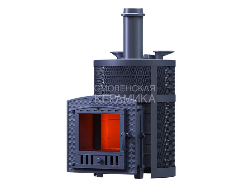 Чугунная банная печь с прямым нагревом парообразователя. Печь со стенками толщиной 14 миллиметров быстро нагревает воздух в парной и производит качественный мелкодисперсный пар за счёт теплоёмкой каменки, оснащённой теплосъёмными шипами на нижней поверхности.