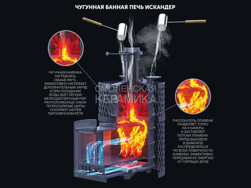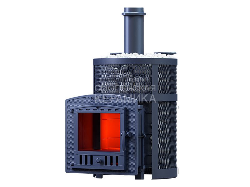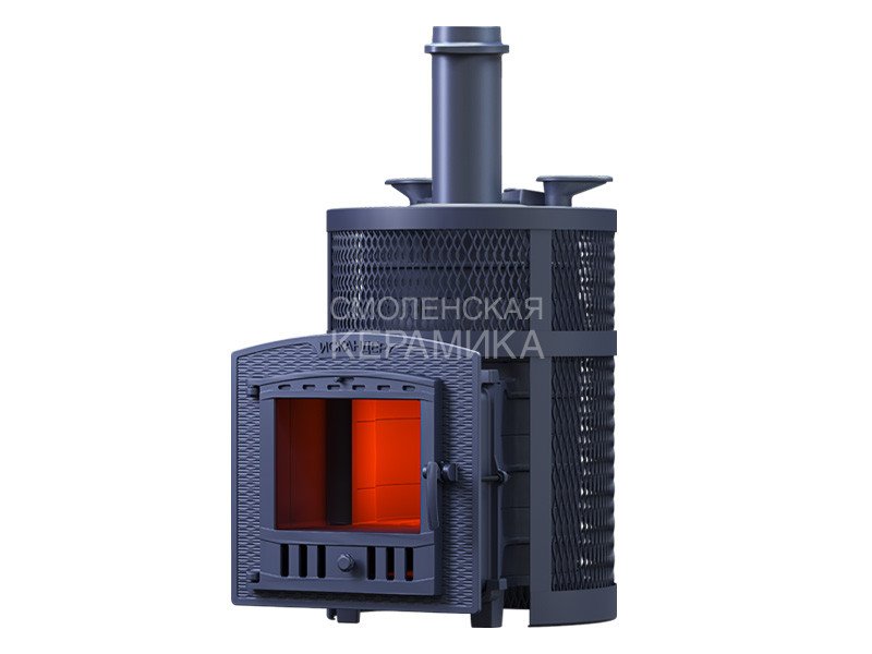 Чугунная банная печь Искандер 25 Pro с прямым нагревом парообразователя. Печь со стенками толщиной 14 мм. Быстро нагревает воздух в парной и производит качественный мелкодисперсный пар за счёт теплоёмкой каменки, оснащённой теплосъёмными шипами на нижней поверхности.