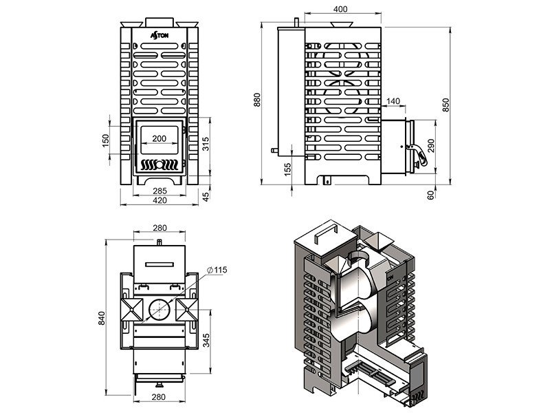 Глубокая невентилируемая каменка-труба из стали 09Г2С толщиной 4 мм прогревается открытым пламенем для максимального нагрева камней, заложенных в нее и выполняет роль пламегасителя.