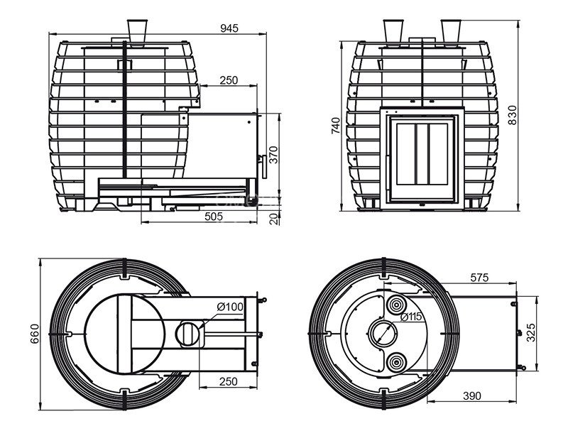 Стартовый участок дымоотводящей трубы толщиной 4 мм и диаметром 115 мм предназначен для максимального теплосъёма, он увеличивает площадь нагрева заклада внутри каменки, что быстрее выводит печь в рабоч