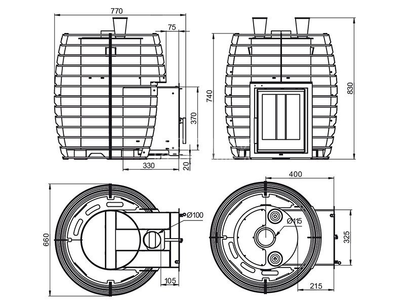 Печь изготовлена из нержавеющей стали AISI 430 c толщиной элементов от 4 до 24 мм в зависимости от участка. Мощностью 24 кВт, она с легкостью прогреет парную от 12 до 24 кубических метров. Усиленная кольцевая сетка конвектор так же сделанная из нержавеющей стали, прекрасно подчеркивает стиль и дизайн печи. В неё помещается около 140 – 200 кг камней в зависимости от их вида, плотности укладки и фракции.