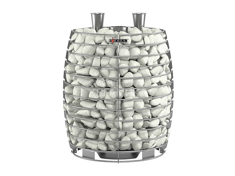 Печь изготовлена из нержавеющей стали AISI 430 c толщиной элементов от 4 до 24 мм в зависимости от участка. Мощностью 24 кВт, она с легкостью прогреет парную от 12 до 24 кубических метров. Усиленная кольцевая сетка конвектор так же сделанная из нержавеющей стали, прекрасно подчеркивает стиль и дизайн печи. В неё помещается около 140 – 200 кг камней в зависимости от их вида, плотности укладки и фракции.