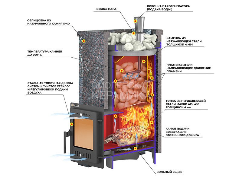 Конструкция печи включает в себя закрытую каменку из нержавейки марки AISI-430 толщиной 4 мм, расположенную в верхней части топки. Каменка размещена прямо на пути пламени и дымовых газов, что позволяет нагреть камни до температур свыше 600°C.