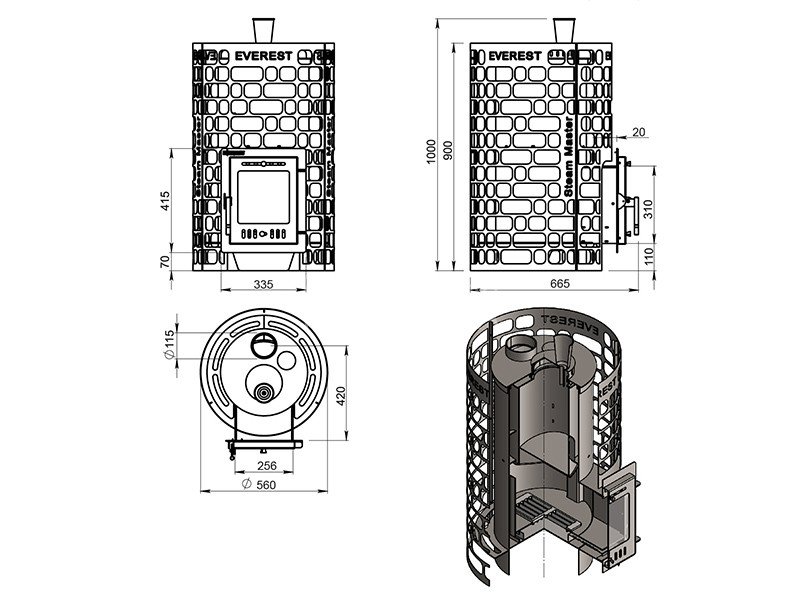 Печь для бани Эверест "Steam Master" 24 INOX (210М) б/в изготовлена из нержавеющей стали и предназначена для установки в частные и коммерческие бани с объёмами парных помещений от 12 до 24 м3.