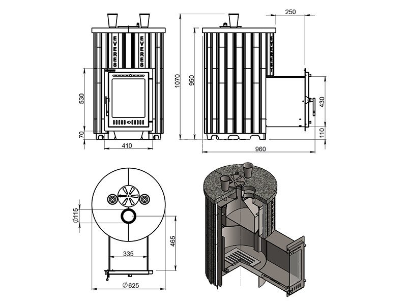 Печь и облицовка – цилиндрической формы, компактная и удобно размещаемая в парилке. Выносной тоннель при монтаже печи проводится через стену и предполагает обслуживание печи из смежного помещения.