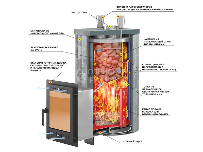 Конструкция печи включает в себя закрытую каменку из нержавейки марки AISI-430 толщиной 4 мм, расположенную в верхней части топки. Каменка размещена прямо на пути пламени и дымовых газов, что позволяет нагреть камни до температур свыше 600°C.