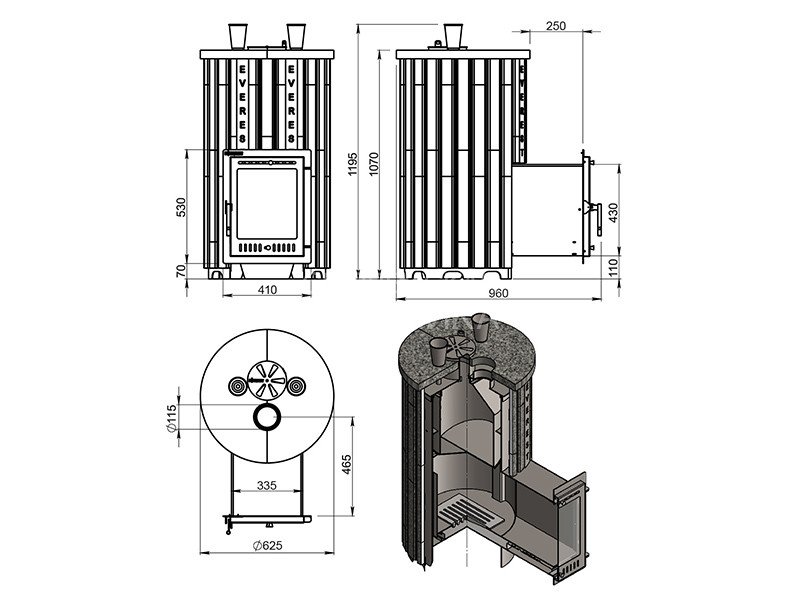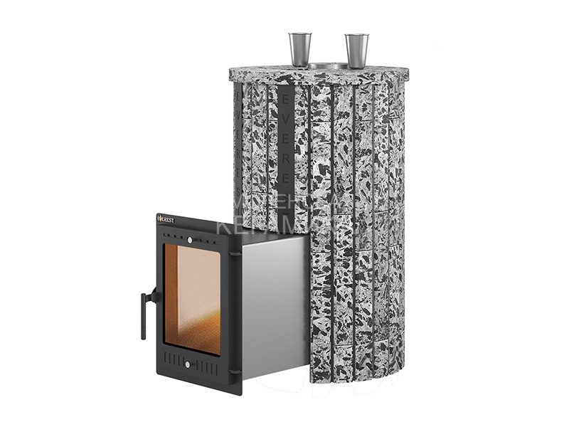 Печь и облицовка – цилиндрической формы, компактная и удобно размещаемая в парилке. Выносной тоннель при монтаже печи проводится через стену и предполагает обслуживание печи из смежного помещения.