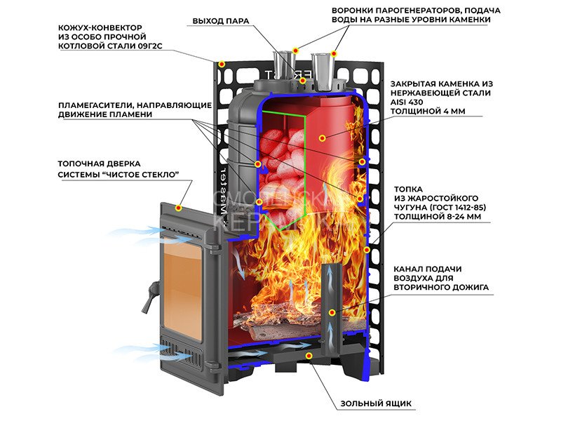 Топочная камера печи – сборная, состоит из трёх деталей, соединяемых между собой на болтах. Вертикальные швы по краю деталей соединяются по принципу паз-гребень, что обеспечивает высокую герметичность топки и минимальную деформацию даже при длительном нагреве. Соединение не требует применения уплотнителей шва, достаточно только герметика.