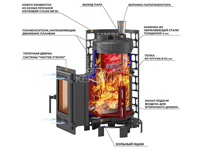 Банная печь предназначена для нагрева помещений и получения пара в парных объёмом до 18 м3.