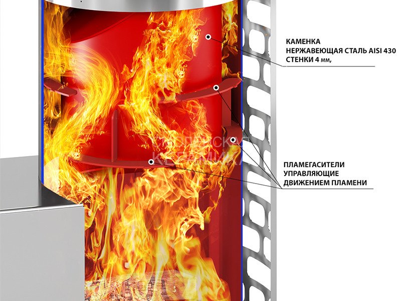 Топочная камера печи – сборная, состоит из трёх деталей, соединяемых между собой на болтах. Вертикальные швы по краю деталей соединяются по принципу паз-гребень, что обеспечивает высокую герметичность топки и минимальную деформацию даже при длительном нагреве. Соединение не требует применения уплотнителей шва, достаточно только герметика.