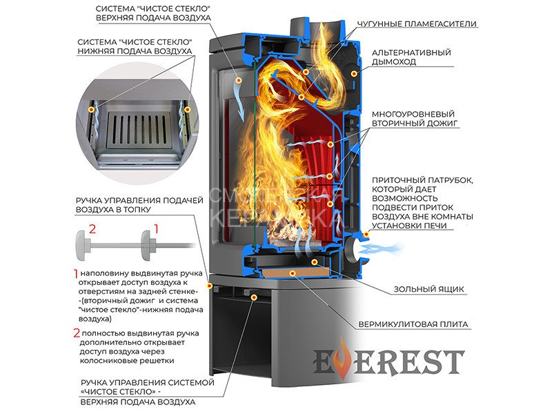Регулировка этой системы, как и подача воздуха в колосниковую зону осуществляется рычагом, расположенным слева в нижней части печи-камина. В правой нижней части расположена ручка регулировки системы чистое стекло, которая препятствует оседанию сажи на внутреннюю