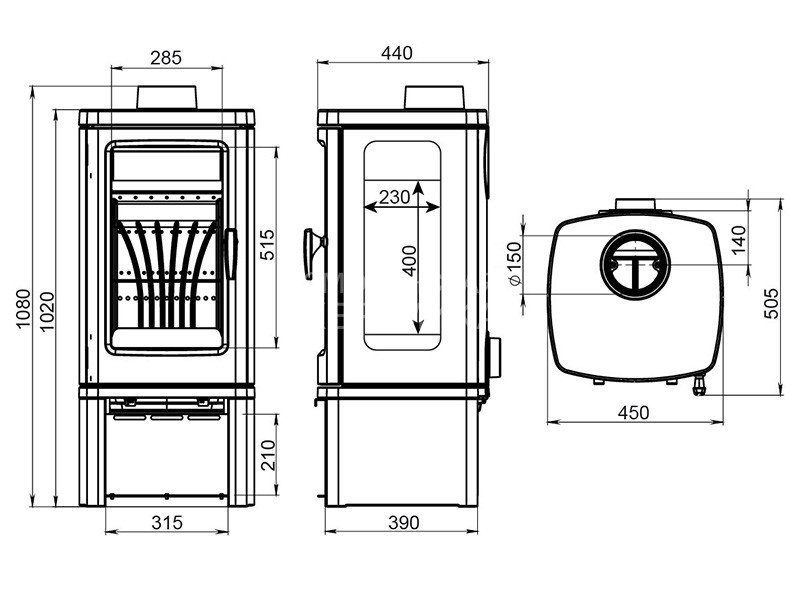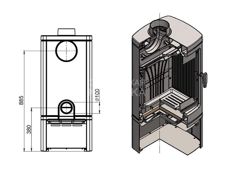 Печь-камин имеет два чугунных пламегасителя, обеспечивающие высокий КПД печи. На боковых стенках интегрированы жаростойкие стёкла, которые открывают ещё больше вида на горящее пламя. Топка печи-камина усилена чугунными вставками с системой четырехуровневого вторичного дожига. С помощью этой функции по каналам подачи вторичного воздуха поступает воздух, который нагревается при прохождении между топочной камерой и стенками корпуса. Далее нагретый воздух через дефлектор поступает в топку, перемешивается с газами - продуктами горения, чем вызывает повторное возгорание.