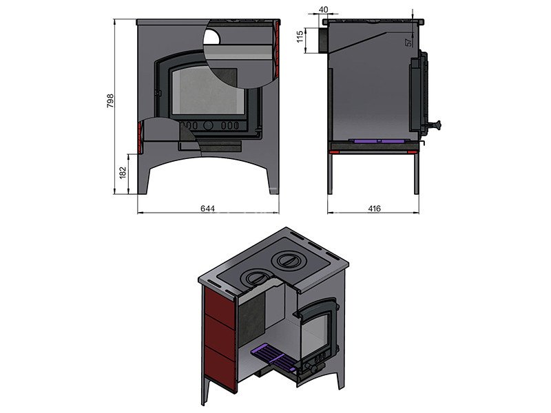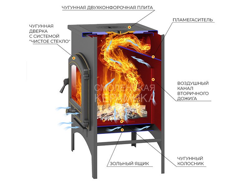 Верхнюю горизонтальную поверхность можно использовать для приготовления пищи. Печь укомплектована чугунным колосником и чугунной негерметичной дверцей Везувий ДТ-4. Печь облицована керамической плиткой для лучшего распределения тепла.