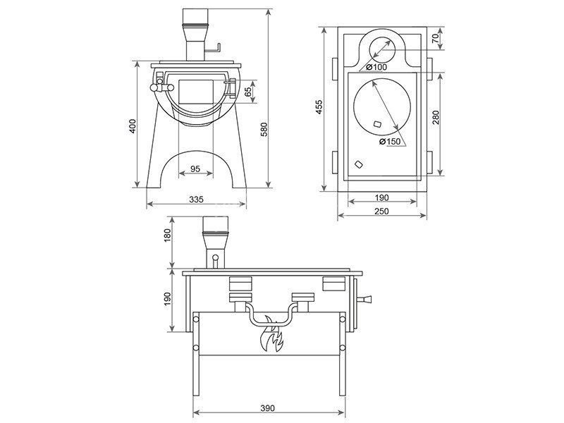 Ширина: 625 ммВысота: 1520 ммГлубина: 670 ммВес: 23 кгДиаметр дымохода: 100 ммМатериал: жаростойкий чугун (ГОСТ 1412-85)