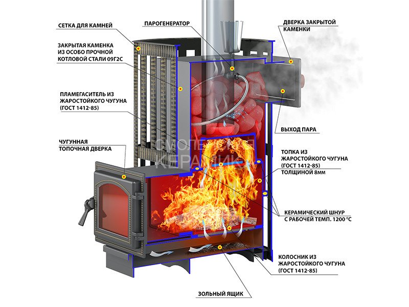 Преимущество печи серии УРАГАН в том, что она состоит из 3-х элементов. На стыке между ними используется керамический шнур с рабочей температурой 1200 градусов, топка печи абсолютно герметична. Для фиксации деталей между собой применяется болтовое соединение, что даёт 100% гарантию безопасности при эксплуатации.