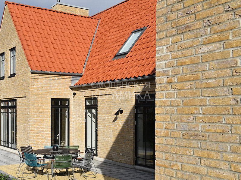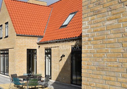 Полнотелый кирпич ручной формовки RT 454 Rustica Giallo Handform ziegel из серии RUSTICA производится на заводе RANDERS TEGL в Дании форматом и размером - ECO-DNF 228X50X54 мм, имеет преимущественно желтый цвет с белыми и черными подпалинами, которые наделяют этот цвет изысканностью состаренного кирпича. Применяется при возведении фасадов зданий, заборов, а так же в оформлении печей, каминов. Формат с приставкой ECO - является экономичным, это тонкий кирпич, т.е. половинчатый или распиленный на две части.