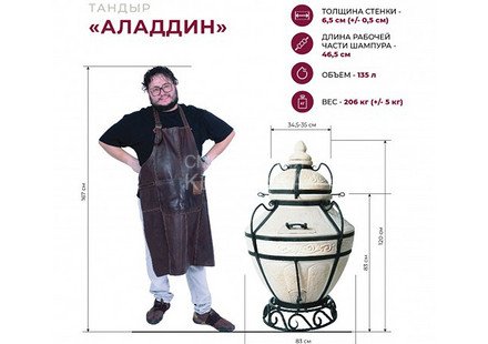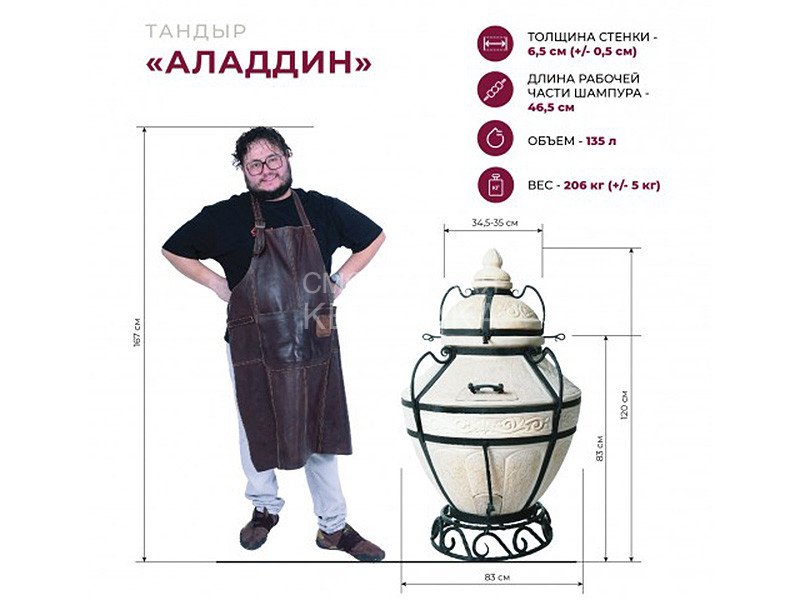 Печь Тандыр Аладдин - это последняя разработка самого популярного производителя тандыров, компании "Амфора". О нем можно говорить только в превосходной степени! Настоящий тандыр является самым большим и универсальным, и предназначен для приготовления всех видов блюд: на шампурах, крюках, решетках и стенках, а также в сковородах, воках и чугунках. По утверждению профессионалов в нем можно приготовить до 26 лепешек за раз, в то время как в Восточном тандыре только 20 (количество лепешек зависит от их диаметра и профессионализма повара). А 20 удлиненных кованых шампуров не оставят голодными даже очень большую компанию любителей шашлыка.