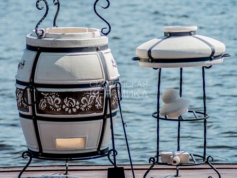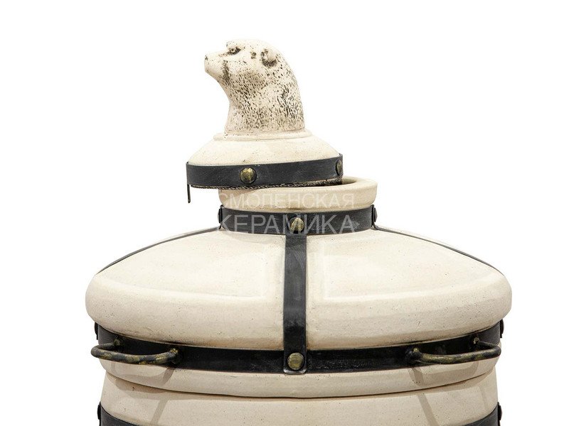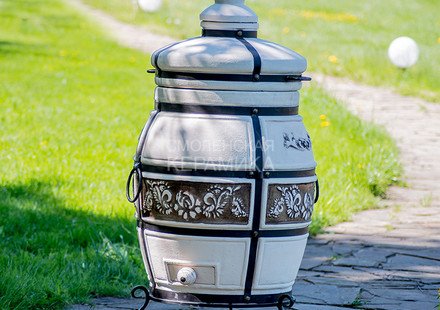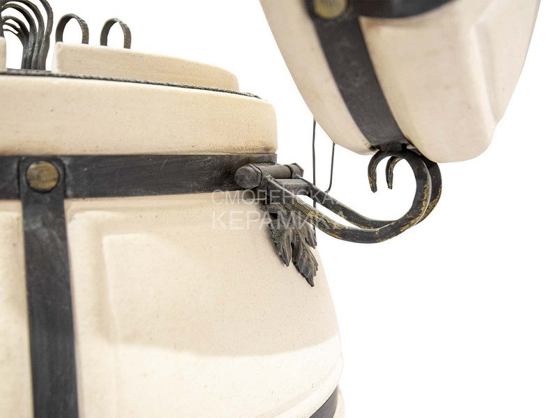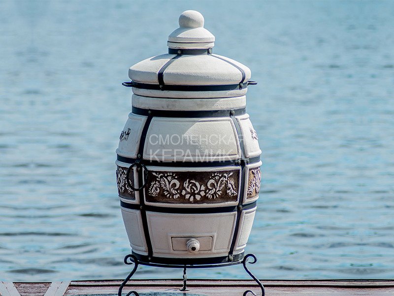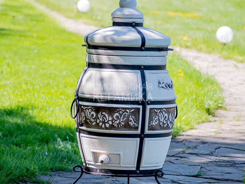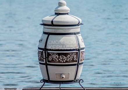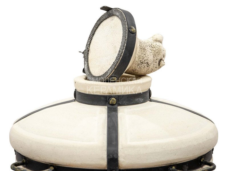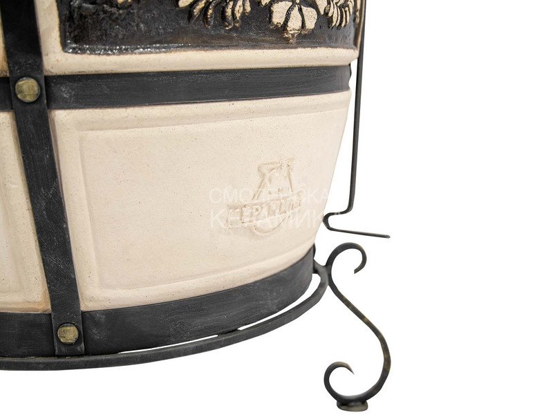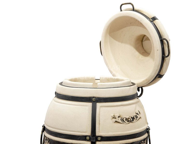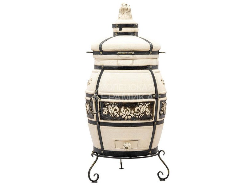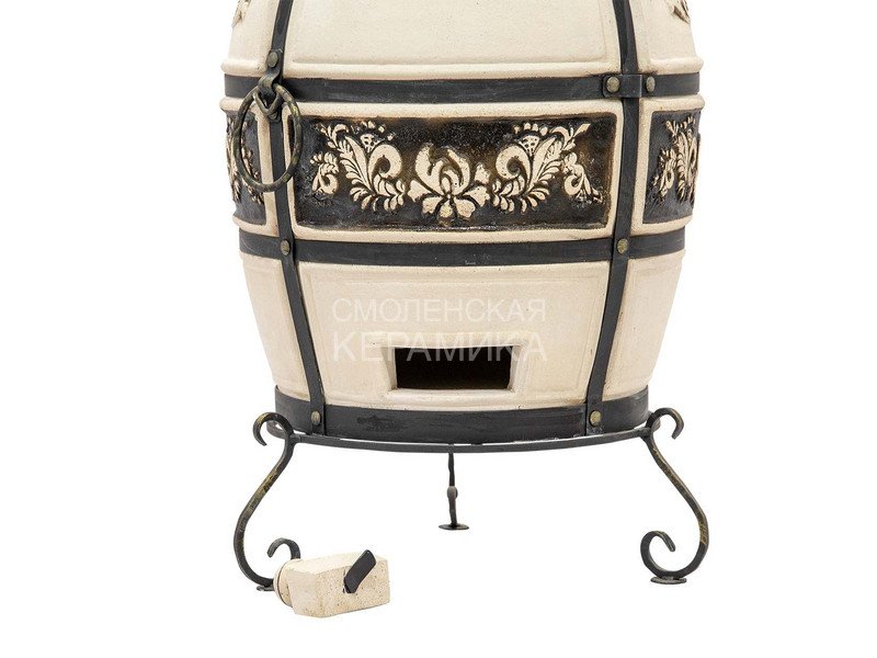 Тандыр "Казачий" выполнен в виде округлого бочонка большого объёма. Тандыр имеет крышки двух уровней (колпачок и крышку). Удобно выполненный колпачок, позволяет не терять тепло при открывании тандыра. А крышка с удобными ручками позволяет легко открывать тандыр и закладывать в него продукты для приготовления. Кованная подставка - ножки обеспечивает удобное использование тандыра. Красоту тандыру придаёт интересный орнаментальный растительный узор, расположенный в центральной его части. Керамический тандыр в основном выполнен в бежевом цвете, коричневый цвет добавлен в области орнамента. На поверхность орнамента нанесена глазурь, которая защищает его от вл