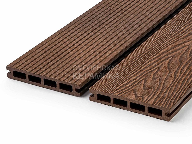 Поверхности: рельефная 3D-фактура «под дерево» и «вельвет». Способ монтажа: кляммером (клипсой) к лаге каркаса из ДПК, алюминия или металла — скрытый крепёж. Надёжная упаковка по две штуки в термоусадочную плёнку поможет избежать царапин и потёртостей при поштучной перевозке.